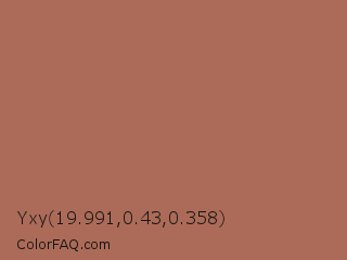 Yxy 19.991,0.43,0.358 Color is a normal red color and the nearest color is Santa Fe #b16d52. Hex code #ac6b58 and RGB value is rgb(172,107,88). In RGB color space, this color is composed of 67% red, 42% green, 35% blue, In CMYK color space, this color is composed of 0% cyan, 38% magenta, 49% yellow , 33% black , In HSL color space, this color has a hue angle of 14° , 34% saturation and 51% lightness.