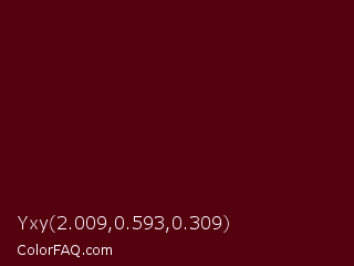 Yxy 2.009,0.593,0.309 Color is a very dark red color and the nearest color is Dark Scarlet #560319. Hex code #55020f and RGB value is rgb(85,2,15). In RGB color space, this color is composed of 33% red, 1% green, 6% blue, In CMYK color space, this color is composed of 0% cyan, 98% magenta, 82% yellow , 67% black , In HSL color space, this color has a hue angle of 351° , 95% saturation and 17% lightness.