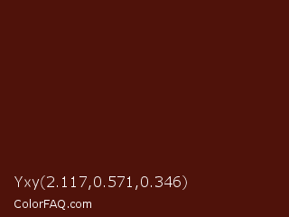 Yxy 2.117,0.571,0.346 Color is a very dark red color and the nearest color is French Puce #4e1609. Hex code #4f120a and RGB value is rgb(79,18,10). In RGB color space, this color is composed of 31% red, 7% green, 4% blue, In CMYK color space, this color is composed of 0% cyan, 77% magenta, 87% yellow , 69% black , In HSL color space, this color has a hue angle of 7° , 78% saturation and 17% lightness.
