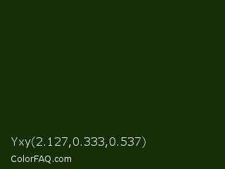 Yxy 2.127,0.333,0.537 Color is a very dark green color and the nearest color is Deep Forest Green #182d09. Hex code #152e06 and RGB value is rgb(21,46,6). In RGB color space, this color is composed of 8% red, 18% green, 2% blue, In CMYK color space, this color is composed of 54% cyan, 0% magenta, 87% yellow , 82% black , In HSL color space, this color has a hue angle of 98° , 77% saturation and 10% lightness.