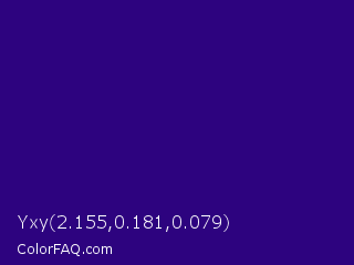 Yxy 2.155,0.181,0.079 Color is a dark indigo color and the nearest color is Deep Blue #220878. Hex code #2d037f and RGB value is rgb(45,3,127). In RGB color space, this color is composed of 18% red, 1% green, 50% blue, In CMYK color space, this color is composed of 65% cyan, 98% magenta, 0% yellow , 50% black , In HSL color space, this color has a hue angle of 260° , 95% saturation and 25% lightness.