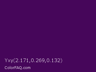 Yxy 2.171,0.269,0.132 Color is a very dark purple color and the nearest color is Clairvoyant #480656. Hex code #46065a and RGB value is rgb(70,6,90). In RGB color space, this color is composed of 27% red, 2% green, 35% blue, In CMYK color space, this color is composed of 22% cyan, 93% magenta, 0% yellow , 65% black , In HSL color space, this color has a hue angle of 286° , 88% saturation and 19% lightness.