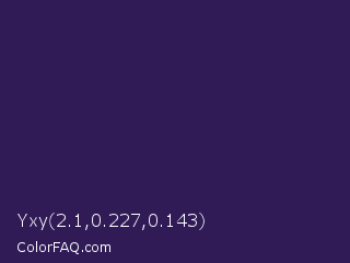 Yxy 2.1,0.227,0.143 Color is a very dark violet color and the nearest color is Valhalla #2b194f. Hex code #301b57 and RGB value is rgb(48,27,87). In RGB color space, this color is composed of 19% red, 11% green, 34% blue, In CMYK color space, this color is composed of 45% cyan, 69% magenta, 0% yellow , 66% black , In HSL color space, this color has a hue angle of 261° , 53% saturation and 22% lightness.