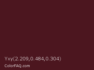 Yxy 2.209,0.484,0.304 Color is a very dark red color and the nearest color is Cocoa Bean #481c1c. Hex code #4c161f and RGB value is rgb(76,22,31). In RGB color space, this color is composed of 30% red, 9% green, 12% blue, In CMYK color space, this color is composed of 0% cyan, 71% magenta, 59% yellow , 70% black , In HSL color space, this color has a hue angle of 350° , 55% saturation and 19% lightness.
