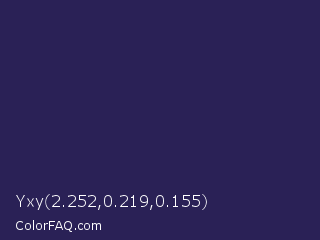 Yxy 2.252,0.219,0.155 Color is a dark indigo color and the nearest color is Port Gore #251f4f. Hex code #2a2156 and RGB value is rgb(42,33,86). In RGB color space, this color is composed of 16% red, 13% green, 34% blue, In CMYK color space, this color is composed of 51% cyan, 62% magenta, 0% yellow , 66% black , In HSL color space, this color has a hue angle of 250° , 45% saturation and 23% lightness.