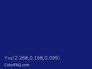 Yxy 2.268,0.168,0.099 Color is a dark blue color and the nearest color is Midnight Blue #191970. Hex code #121d74 and RGB value is rgb(18,29,116). In RGB color space, this color is composed of 7% red, 11% green, 45% blue, In CMYK color space, this color is composed of 84% cyan, 75% magenta, 0% yellow , 55% black , In HSL color space, this color has a hue angle of 233° , 73% saturation and 26% lightness.
