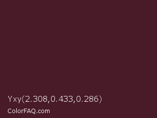 Yxy 2.308,0.433,0.286 Color is a very dark rose color and the nearest color is Crater Brown #462425. Hex code #491a28 and RGB value is rgb(73,26,40). In RGB color space, this color is composed of 29% red, 10% green, 16% blue, In CMYK color space, this color is composed of 0% cyan, 64% magenta, 45% yellow , 71% black , In HSL color space, this color has a hue angle of 342° , 47% saturation and 19% lightness.