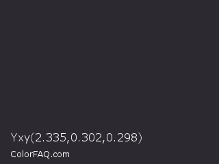 Yxy 2.335,0.302,0.298 Color is a very dark violet color and the nearest color is Baltic Sea #2a2630. Hex code #2c2930 and RGB value is rgb(44,41,48). In RGB color space, this color is composed of 17% red, 16% green, 19% blue, In CMYK color space, this color is composed of 8% cyan, 15% magenta, 0% yellow , 81% black , In HSL color space, this color has a hue angle of 266° , 8% saturation and 17% lightness.