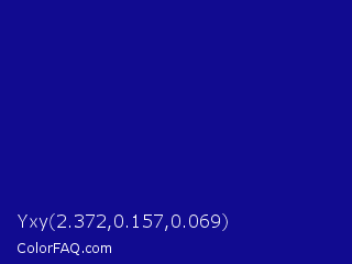 Yxy 2.372,0.157,0.069 Color is a dark indigo color and the nearest color is Ultramarine #120a8f. Hex code #110b90 and RGB value is rgb(17,11,144). In RGB color space, this color is composed of 7% red, 4% green, 56% blue, In CMYK color space, this color is composed of 88% cyan, 92% magenta, 0% yellow , 44% black , In HSL color space, this color has a hue angle of 243° , 86% saturation and 30% lightness.