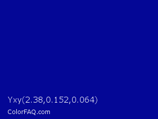 Yxy 2.38,0.152,0.064 Color is a dark blue color and the nearest color is Duke Blue #00009c. Hex code #040796 and RGB value is rgb(4,7,150). In RGB color space, this color is composed of 2% red, 3% green, 59% blue, In CMYK color space, this color is composed of 97% cyan, 95% magenta, 0% yellow , 41% black , In HSL color space, this color has a hue angle of 239° , 95% saturation and 30% lightness.