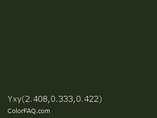 Yxy 2.408,0.333,0.422 Color is a very dark green color and the nearest color is Green Kelp #25311c. Hex code #242e1b and RGB value is rgb(36,46,27). In RGB color space, this color is composed of 14% red, 18% green, 11% blue, In CMYK color space, this color is composed of 22% cyan, 0% magenta, 41% yellow , 82% black , In HSL color space, this color has a hue angle of 92° , 26% saturation and 14% lightness.