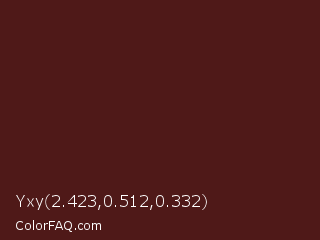 Yxy 2.423,0.512,0.332 Color is a very dark red color and the nearest color is Cocoa Bean #481c1c. Hex code #4f1918 and RGB value is rgb(79,25,24). In RGB color space, this color is composed of 31% red, 10% green, 9% blue, In CMYK color space, this color is composed of 0% cyan, 68% magenta, 70% yellow , 69% black , In HSL color space, this color has a hue angle of 1° , 53% saturation and 20% lightness.