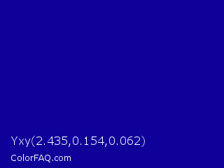 Yxy 2.435,0.154,0.062 Color is a dark indigo color and the nearest color is Ultramarine #120a8f. Hex code #10009a and RGB value is rgb(16,0,154). In RGB color space, this color is composed of 6% red, 0% green, 60% blue, In CMYK color space, this color is composed of 90% cyan, 100% magenta, 0% yellow , 40% black , In HSL color space, this color has a hue angle of 246° , 100% saturation and 30% lightness.