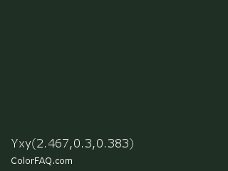 Yxy 2.467,0.3,0.383 Color is a very dark green color and the nearest color is Charleston Green #232b2b. Hex code #202f24 and RGB value is rgb(32,47,36). In RGB color space, this color is composed of 13% red, 18% green, 14% blue, In CMYK color space, this color is composed of 32% cyan, 0% magenta, 23% yellow , 82% black , In HSL color space, this color has a hue angle of 136° , 19% saturation and 15% lightness.