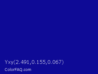 Yxy 2.491,0.155,0.067 Color is a normal indigo color and the nearest color is Ultramarine #120a8f. Hex code #0e0a96 and RGB value is rgb(14,10,150). In RGB color space, this color is composed of 5% red, 4% green, 59% blue, In CMYK color space, this color is composed of 91% cyan, 93% magenta, 0% yellow , 41% black , In HSL color space, this color has a hue angle of 242° , 88% saturation and 31% lightness.