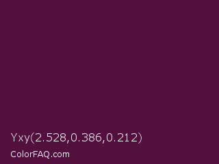 Yxy 2.528,0.386,0.212 Color is a very dark magenta color and the nearest color is Loulou #460b41. Hex code #530f3e and RGB value is rgb(83,15,62). In RGB color space, this color is composed of 33% red, 6% green, 24% blue, In CMYK color space, this color is composed of 0% cyan, 82% magenta, 25% yellow , 67% black , In HSL color space, this color has a hue angle of 319° , 69% saturation and 19% lightness.