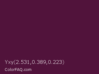 Yxy 2.531,0.389,0.223 Color is a very dark magenta color and the nearest color is Wine Berry #591d35. Hex code #51133b and RGB value is rgb(81,19,59). In RGB color space, this color is composed of 32% red, 7% green, 23% blue, In CMYK color space, this color is composed of 0% cyan, 77% magenta, 27% yellow , 68% black , In HSL color space, this color has a hue angle of 321° , 62% saturation and 20% lightness.