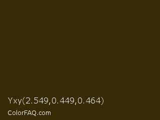 Yxy 2.549,0.449,0.464 Color is a very dark yellow color and the nearest color is Madras #3f3002. Hex code #372b04 and RGB value is rgb(55,43,4). In RGB color space, this color is composed of 22% red, 17% green, 2% blue, In CMYK color space, this color is composed of 0% cyan, 22% magenta, 93% yellow , 78% black , In HSL color space, this color has a hue angle of 46° , 86% saturation and 12% lightness.