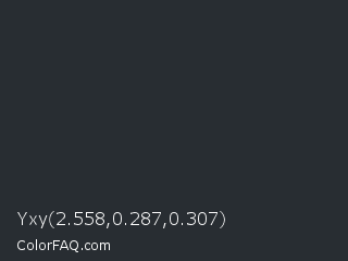 Yxy 2.558,0.287,0.307 Color is a very dark blue color and the nearest color is Charade #292937. Hex code #282d32 and RGB value is rgb(40,45,50). In RGB color space, this color is composed of 16% red, 18% green, 20% blue, In CMYK color space, this color is composed of 20% cyan, 10% magenta, 0% yellow , 80% black , In HSL color space, this color has a hue angle of 210° , 11% saturation and 18% lightness.