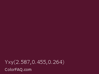 Yxy 2.587,0.455,0.264 Color is a very dark rose color and the nearest color is Wine Berry #591d35. Hex code #55132d and RGB value is rgb(85,19,45). In RGB color space, this color is composed of 33% red, 7% green, 18% blue, In CMYK color space, this color is composed of 0% cyan, 78% magenta, 47% yellow , 67% black , In HSL color space, this color has a hue angle of 336° , 63% saturation and 20% lightness.