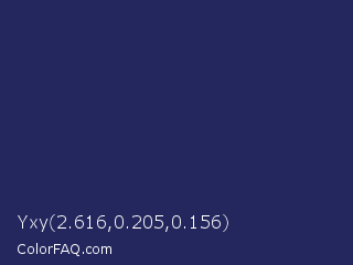 Yxy 2.616,0.205,0.156 Color is a dark blue color and the nearest color is Cloud Burst #202e54. Hex code #24275d and RGB value is rgb(36,39,93). In RGB color space, this color is composed of 14% red, 15% green, 36% blue, In CMYK color space, this color is composed of 61% cyan, 58% magenta, 0% yellow , 64% black , In HSL color space, this color has a hue angle of 237° , 44% saturation and 25% lightness.