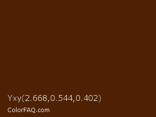 Yxy 2.668,0.544,0.402 Color is a very dark orange color and the nearest color is Indian Tan #4d1e01. Hex code #4d2101 and RGB value is rgb(77,33,1). In RGB color space, this color is composed of 30% red, 13% green, 0% blue, In CMYK color space, this color is composed of 0% cyan, 57% magenta, 99% yellow , 70% black , In HSL color space, this color has a hue angle of 25° , 97% saturation and 15% lightness.