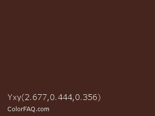 Yxy 2.677,0.444,0.356 Color is a very dark red color and the nearest color is Cork #40291d. Hex code #45251d and RGB value is rgb(69,37,29). In RGB color space, this color is composed of 27% red, 15% green, 11% blue, In CMYK color space, this color is composed of 0% cyan, 46% magenta, 58% yellow , 73% black , In HSL color space, this color has a hue angle of 12° , 41% saturation and 19% lightness.
