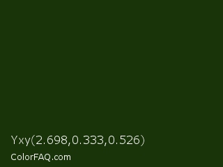 Yxy 2.698,0.333,0.526 Color is a very dark green color and the nearest color is Palm Leaf #19330e. Hex code #1a340a and RGB value is rgb(26,52,10). In RGB color space, this color is composed of 10% red, 20% green, 4% blue, In CMYK color space, this color is composed of 50% cyan, 0% magenta, 81% yellow , 80% black , In HSL color space, this color has a hue angle of 97° , 68% saturation and 12% lightness.