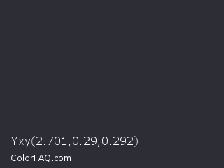 Yxy 2.701,0.29,0.292 Color is a very dark blue color and the nearest color is Charade #292937. Hex code #2d2d36 and RGB value is rgb(45,45,54). In RGB color space, this color is composed of 18% red, 18% green, 21% blue, In CMYK color space, this color is composed of 17% cyan, 17% magenta, 0% yellow , 79% black , In HSL color space, this color has a hue angle of 240° , 9% saturation and 19% lightness.