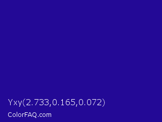 Yxy 2.733,0.165,0.072 Color is a normal indigo color and the nearest color is Blue Gem #2c0e8c. Hex code #230996 and RGB value is rgb(35,9,150). In RGB color space, this color is composed of 14% red, 4% green, 59% blue, In CMYK color space, this color is composed of 77% cyan, 94% magenta, 0% yellow , 41% black , In HSL color space, this color has a hue angle of 251° , 89% saturation and 31% lightness.