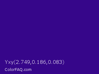 Yxy 2.749,0.186,0.083 Color is a dark violet color and the nearest color is Blue Gem #2c0e8c. Hex code #36068a and RGB value is rgb(54,6,138). In RGB color space, this color is composed of 21% red, 2% green, 54% blue, In CMYK color space, this color is composed of 61% cyan, 96% magenta, 0% yellow , 46% black , In HSL color space, this color has a hue angle of 262° , 92% saturation and 28% lightness.