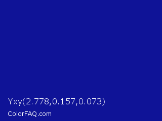 Yxy 2.778,0.157,0.073 Color is a normal blue color and the nearest color is Ultramarine #120a8f. Hex code #0f1397 and RGB value is rgb(15,19,151). In RGB color space, this color is composed of 6% red, 7% green, 59% blue, In CMYK color space, this color is composed of 90% cyan, 87% magenta, 0% yellow , 41% black , In HSL color space, this color has a hue angle of 238° , 82% saturation and 33% lightness.