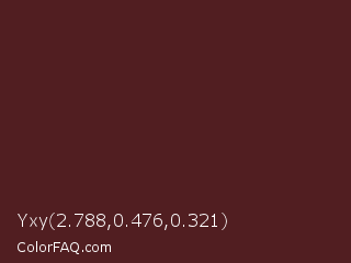 Yxy 2.788,0.476,0.321 Color is a very dark red color and the nearest color is Cocoa Bean #481c1c. Hex code #511e21 and RGB value is rgb(81,30,33). In RGB color space, this color is composed of 32% red, 12% green, 13% blue, In CMYK color space, this color is composed of 0% cyan, 63% magenta, 59% yellow , 68% black , In HSL color space, this color has a hue angle of 356° , 46% saturation and 22% lightness.