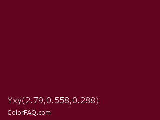 Yxy 2.79,0.558,0.288 Color is a very dark rose color and the nearest color is Bordeaux #5c0120. Hex code #63021e and RGB value is rgb(99,2,30). In RGB color space, this color is composed of 39% red, 1% green, 12% blue, In CMYK color space, this color is composed of 0% cyan, 98% magenta, 70% yellow , 61% black , In HSL color space, this color has a hue angle of 343° , 96% saturation and 20% lightness.
