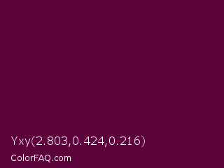 Yxy 2.803,0.424,0.216 Color is a very dark magenta color and the nearest color is Mulberry Wood #5c0536. Hex code #5e043d and RGB value is rgb(94,4,61). In RGB color space, this color is composed of 37% red, 2% green, 24% blue, In CMYK color space, this color is composed of 0% cyan, 96% magenta, 35% yellow , 63% black , In HSL color space, this color has a hue angle of 322° , 92% saturation and 19% lightness.