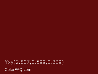 Yxy 2.807,0.599,0.329 Color is a very dark red color and the nearest color is Dark Tan #661010. Hex code #610b0c and RGB value is rgb(97,11,12). In RGB color space, this color is composed of 38% red, 4% green, 5% blue, In CMYK color space, this color is composed of 0% cyan, 89% magenta, 88% yellow , 62% black , In HSL color space, this color has a hue angle of 359° , 80% saturation and 21% lightness.
