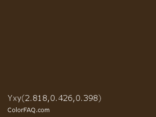 Yxy 2.818,0.426,0.398 Color is a very dark orange color and the nearest color is Black Marlin #3e2c1c. Hex code #3e2b18 and RGB value is rgb(62,43,24). In RGB color space, this color is composed of 24% red, 17% green, 9% blue, In CMYK color space, this color is composed of 0% cyan, 31% magenta, 61% yellow , 76% black , In HSL color space, this color has a hue angle of 30° , 44% saturation and 17% lightness.