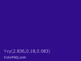Yxy 2.836,0.18,0.083 Color is a dark indigo color and the nearest color is Blue Gem #2c0e8c. Hex code #310d8c and RGB value is rgb(49,13,140). In RGB color space, this color is composed of 19% red, 5% green, 55% blue, In CMYK color space, this color is composed of 65% cyan, 91% magenta, 0% yellow , 45% black , In HSL color space, this color has a hue angle of 257° , 83% saturation and 30% lightness.