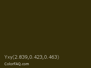 Yxy 2.839,0.423,0.463 Color is a very dark yellow color and the nearest color is Brown Tumbleweed #37290e. Hex code #362f0a and RGB value is rgb(54,47,10). In RGB color space, this color is composed of 21% red, 18% green, 4% blue, In CMYK color space, this color is composed of 0% cyan, 13% magenta, 81% yellow , 79% black , In HSL color space, this color has a hue angle of 50° , 69% saturation and 13% lightness.