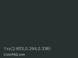 Yxy 2.853,0.294,0.338 Color is a very dark cyan color and the nearest color is Heavy Metal #2b3228. Hex code #28312f and RGB value is rgb(40,49,47). In RGB color space, this color is composed of 16% red, 19% green, 18% blue, In CMYK color space, this color is composed of 18% cyan, 0% magenta, 4% yellow , 81% black , In HSL color space, this color has a hue angle of 167° , 10% saturation and 17% lightness.