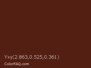 Yxy 2.863,0.525,0.361 Color is a very dark red color and the nearest color is Redwood #5d1e0f. Hex code #531f12 and RGB value is rgb(83,31,18). In RGB color space, this color is composed of 33% red, 12% green, 7% blue, In CMYK color space, this color is composed of 0% cyan, 63% magenta, 78% yellow , 67% black , In HSL color space, this color has a hue angle of 12° , 64% saturation and 20% lightness.