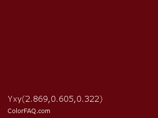 Yxy 2.869,0.605,0.322 Color is a very dark red color and the nearest color is Rosewood #65000b. Hex code #64060d and RGB value is rgb(100,6,13). In RGB color space, this color is composed of 39% red, 2% green, 5% blue, In CMYK color space, this color is composed of 0% cyan, 94% magenta, 87% yellow , 61% black , In HSL color space, this color has a hue angle of 356° , 89% saturation and 21% lightness.