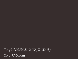 Yxy 2.878,0.342,0.329 Color is a very dark red color and the nearest color is Thunder #33292f. Hex code #372d2d and RGB value is rgb(55,45,45). In RGB color space, this color is composed of 22% red, 18% green, 18% blue, In CMYK color space, this color is composed of 0% cyan, 18% magenta, 18% yellow , 78% black , In HSL color space, this color has a hue angle of 0° , 10% saturation and 20% lightness.