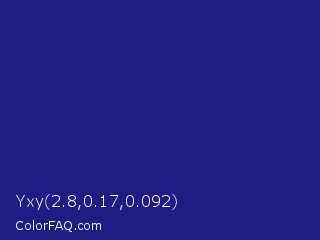 Yxy 2.8,0.17,0.092 Color is a normal indigo color and the nearest color is Jacksons Purple #20208d. Hex code #1e1c85 and RGB value is rgb(30,28,133). In RGB color space, this color is composed of 12% red, 11% green, 52% blue, In CMYK color space, this color is composed of 77% cyan, 79% magenta, 0% yellow , 48% black , In HSL color space, this color has a hue angle of 241° , 65% saturation and 32% lightness.