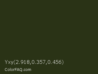 Yxy 2.918,0.357,0.456 Color is a very dark lime color and the nearest color is Mallard #233418. Hex code #2a3316 and RGB value is rgb(42,51,22). In RGB color space, this color is composed of 16% red, 20% green, 9% blue, In CMYK color space, this color is composed of 18% cyan, 0% magenta, 57% yellow , 80% black , In HSL color space, this color has a hue angle of 79° , 40% saturation and 14% lightness.