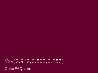 Yxy 2.942,0.503,0.257 Color is a very dark rose color and the nearest color is Black Rose #67032d. Hex code #64022d and RGB value is rgb(100,2,45). In RGB color space, this color is composed of 39% red, 1% green, 18% blue, In CMYK color space, this color is composed of 0% cyan, 98% magenta, 55% yellow , 61% black , In HSL color space, this color has a hue angle of 334° , 96% saturation and 20% lightness.