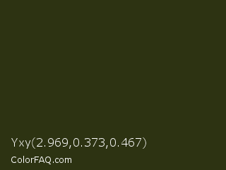 Yxy 2.969,0.373,0.467 Color is a very dark lime color and the nearest color is Turtle Green #2a380b. Hex code #2d3312 and RGB value is rgb(45,51,18). In RGB color space, this color is composed of 18% red, 20% green, 7% blue, In CMYK color space, this color is composed of 12% cyan, 0% magenta, 65% yellow , 80% black , In HSL color space, this color has a hue angle of 71° , 48% saturation and 14% lightness.