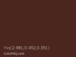 Yxy 2.981,0.452,0.351 Color is a very dark red color and the nearest color is Crater Brown #462425. Hex code #4b261f and RGB value is rgb(75,38,31). In RGB color space, this color is composed of 29% red, 15% green, 12% blue, In CMYK color space, this color is composed of 0% cyan, 49% magenta, 59% yellow , 71% black , In HSL color space, this color has a hue angle of 10° , 42% saturation and 21% lightness.