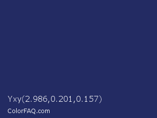 Yxy 2.986,0.201,0.157 Color is a dark blue color and the nearest color is Biscay #1b3162. Hex code #232b63 and RGB value is rgb(35,43,99). In RGB color space, this color is composed of 14% red, 17% green, 39% blue, In CMYK color space, this color is composed of 65% cyan, 57% magenta, 0% yellow , 61% black , In HSL color space, this color has a hue angle of 233° , 48% saturation and 26% lightness.