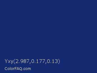 Yxy 2.987,0.177,0.13 Color is a dark blue color and the nearest color is Catalina Blue #062a78. Hex code #132a71 and RGB value is rgb(19,42,113). In RGB color space, this color is composed of 7% red, 16% green, 44% blue, In CMYK color space, this color is composed of 83% cyan, 63% magenta, 0% yellow , 56% black , In HSL color space, this color has a hue angle of 225° , 71% saturation and 26% lightness.